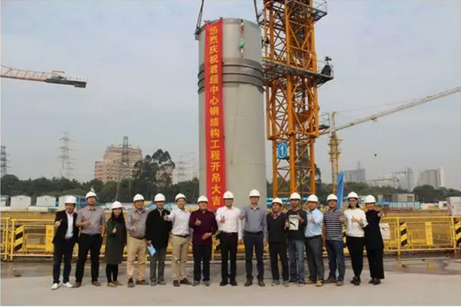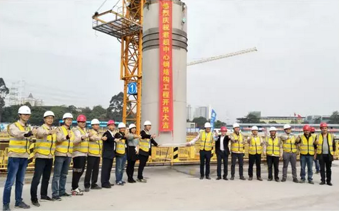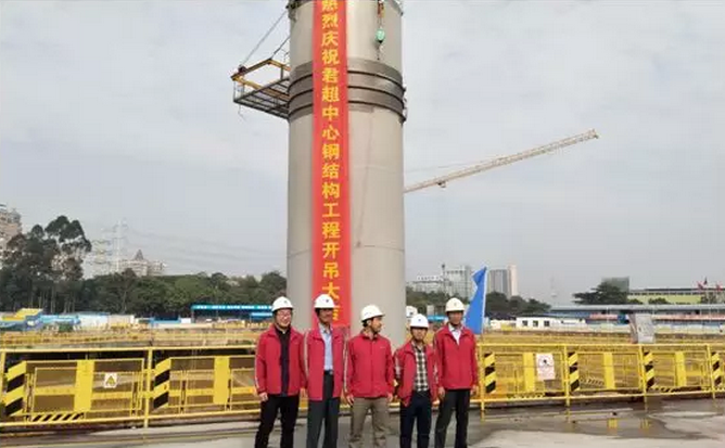 2018年1月4日,在君超中心大底板浇筑完成后,金融城项目团队在总经理带领下再次来到工地现场,一起见证君超中心第一根钢结构柱体的吊装过程。