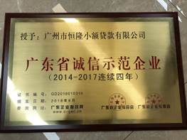 荣膺“广东省诚信示范企业” ,恒隆小贷自2014年到2017年连续四年被评为诚信企业,该荣誉称号由广东省企业联合会、广东省企业家协会共同授予。