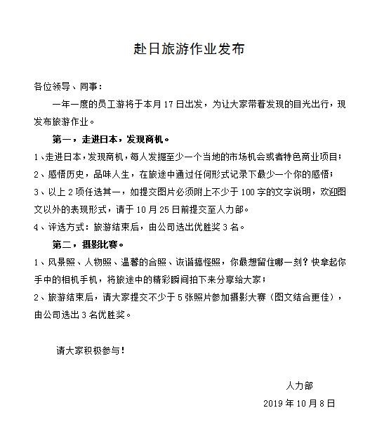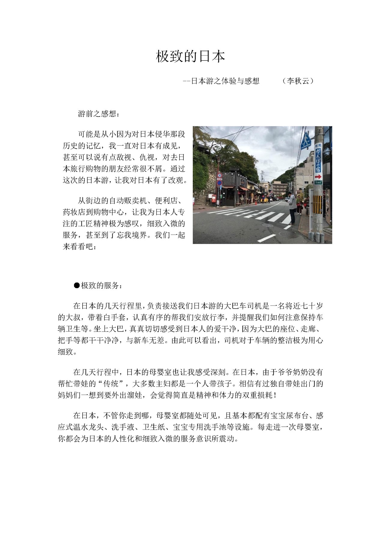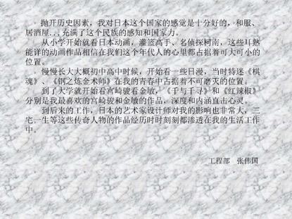 此次活动得到公司全体员工的积极参与,旅游结束后,每个人都认真完成了旅游心得的整理,最终在公司的统一组织评定下,两项作业优胜奖的评选结果公布如下:第一,走进日本,发现商机、感悟历史优胜奖:营销部蔡天时、工程部邓伟明、人力部李秋云。第二,摄影比赛优胜奖:工程部谢文丽、工程部张伟国、人力部张小丽。 以下是获奖者的作品展示: