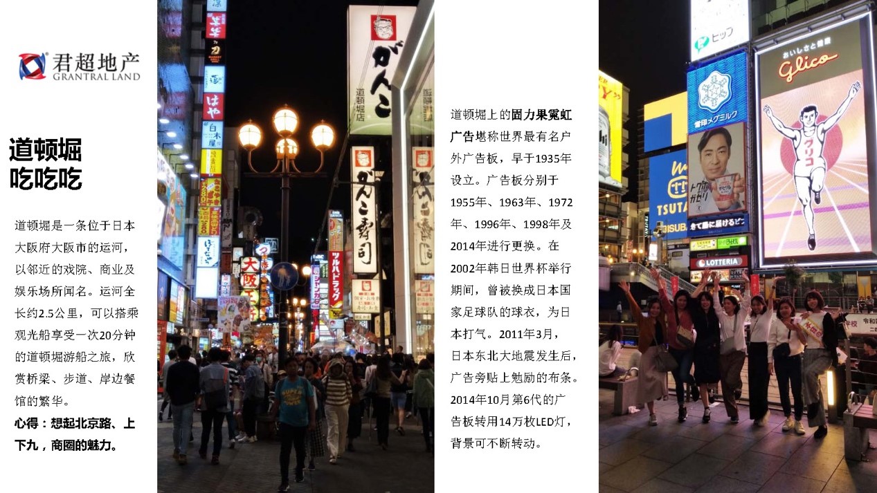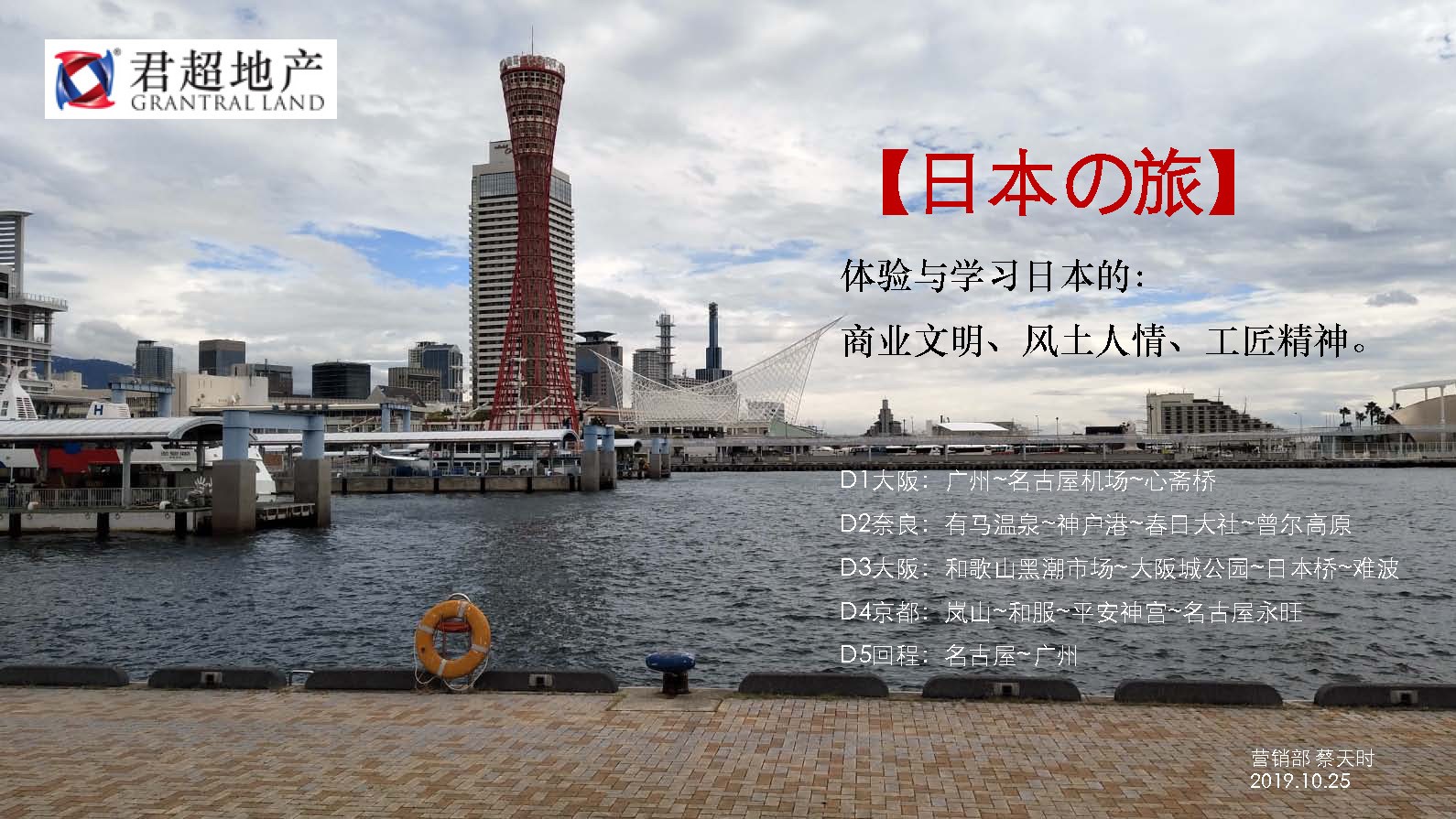 君超地产一年一度的员工旅游,与往年国内游不一样,2019年我们选择了日本关西之旅,10月17日至21日,我们做好攻略,满怀激情地出发了。东渡日本,带着学习的态度,发现的眼睛,在异域风情中,寻找特色商业,发现美丽的风景。公司特意安排了旅游作业比赛: