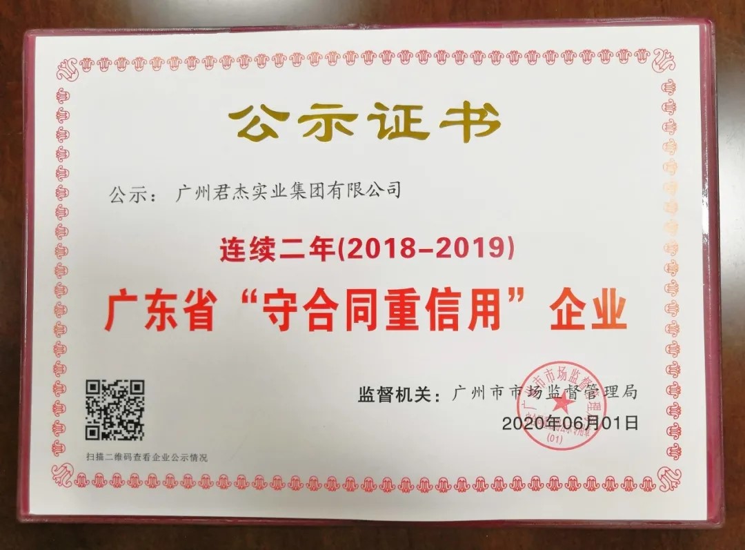 近日,广东省市场监督管理局公布了2019年度广东省“守合同重信用企业”名单,广州君杰实业集团有限公司凭借良好的社会信誉和规范的合同管理体系,顺利通过审核,成功获得2019年度广东省“守合同重信用企业”称号。