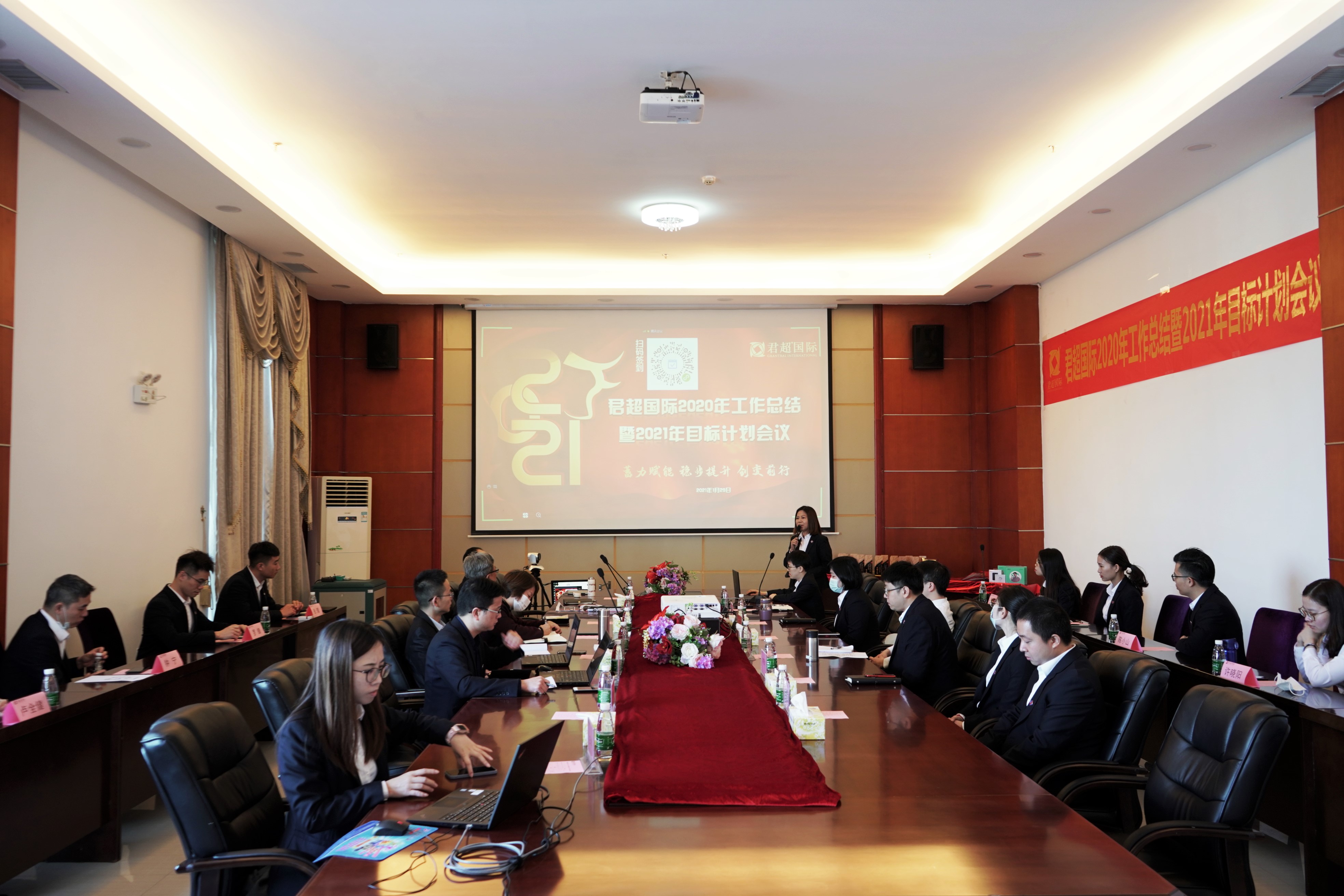 一易一春秋,一载一征程。2020已经结束,一切艰辛都将成为经历,一切美好都会在最后不期而遇。只有很好的总结过去,才能更好地创造未来。2021年1月29日,我们在总部大楼9楼会议室迎来了君超集团2020年工作总结暨2021年目标计划会议。君超集团总裁、副总裁,各中心总监及总部全体员工参加了本次会议。