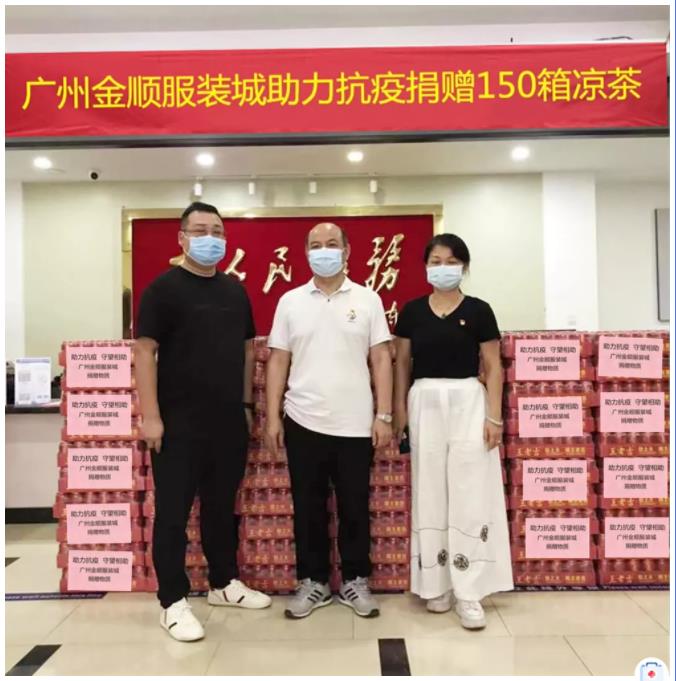 6月5日,君超商业流花站西板块旗下金顺服装城,向越秀区矿泉街道捐赠解暑凉茶150箱以及10000元抗疫物资,以实际行动为广州抗疫一线加油打气!
